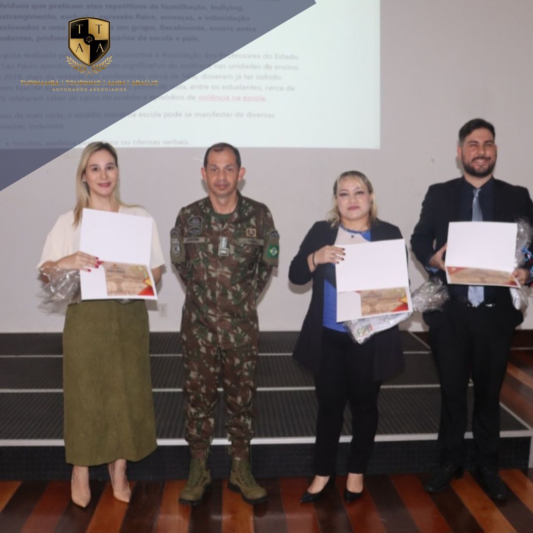 | Imagem 1: Palestra realizada no CMBel em 2023. Da esquerda para direita, Dra. Juliana Pinho Nobre, promotora de justiça da 10º Promotoria da Infância e Juventude do Ministério Público do Estado do Pará, Coronel Comandante e Diretor de Ensino do Colégio Militar de Belém (CMBel), Sr. Jackson Rodrigues de Sousa Júnior, Sra. Isa Pereira, assessora jurídica de assuntos militares do escritório e o sócio diretor do escritório TTAA Dr. Rafael Tupinambá Amim. |