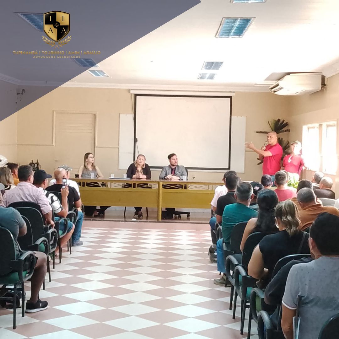 | Imagem 2: Atendimento coletivo realizado em 2024 do grupo Soldados de Cristo. Na bancada, da esquerda para direita - Dra. Milene de Araújo, sócia diretora do escritório TTAA, Sra. Isa Pereira, assessora jurídica de assuntos militares do escritório e o sócio diretor do escritório TTAA Dr. Rafael Tupinambá Amim e com o uso do microfone, o Sr. Aílton Campos, co-dirigente do grupo, atrás dele o Presidente Sr. Carlos Brsail. |